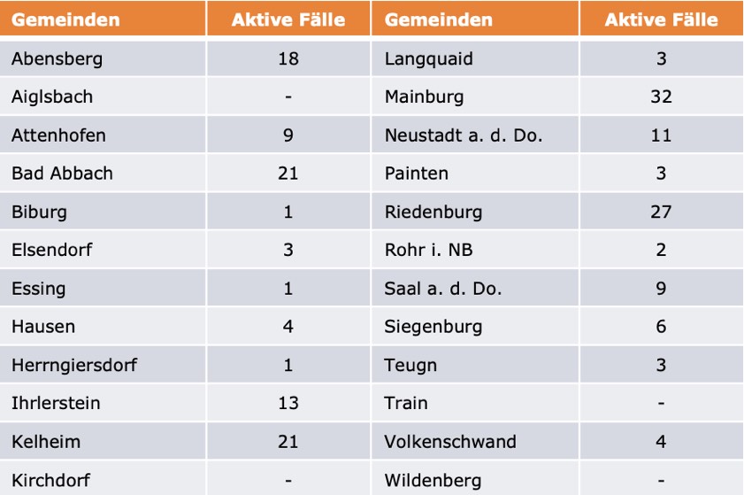 (ty) Im Kreis Kelheim gibt es in Zusammenhang mit der Corona-Pandemie, wie berichtet, mittlerweile 106 Menschenleben zu beklagen. Die weitere Situation stellt sich wie folgt dar: Unter Verweis auf Daten des Gesundheitsamts teilte das Landratsamt heute mit, dass – Stand gestern, 16 Uhr – die Zahl der im Kreis Kelheim positiv auf den neuartigen Erreger getesteten Menschen bei insgesamt 5956 liegt – das ist einer mehr als gestern gemeldet. Insgesamt 5658 hiesige Corona-Patienten (gestern: 5641) wurden wieder aus der Quarantäne entlassen und gelten als genesen. Derzeit gebe es 192 aktive Corona-Fälle im Landkreis (gestern: 208). Zahlen aus den einzelnen Gemeinden zeigt die Tabelle unten.