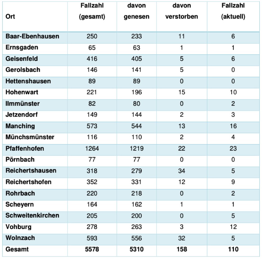(ty) In Zusammenhang mit der Corona-Pandemie gibt es im Kreis Pfaffenhofen, wie berichtet, mittlerweile 158 Menschenleben zu beklagen. Das Landratsamt veröffentlicht eine tägliche Übersicht dazu (Tabelle siehe unten), in welchen Gemeinden die mit dem Virus infizierten Menschen, die gestorben sind, gelebt haben beziehungsweise wie viele bestätigte Infektionsfälle und genesene Patienten es in welcher Kommune gibt. Die Zahl der Landkreis-Bürger, die positiv auf den neuartigen Erreger getestet worden sind, hat sich seit der Meldung von gestern um einen erhöht und beträgt somit 5578. Die Corona-Notbremse wurde im Landkreis ab 18. Mai aufgehoben, nun greifen massive Lockerungen in verschiedenen Bereichen. Außerdem gelten seit 19. Mai weitere Öffnungen, etwa für Außen-Gastro und Kinos. Zusätzliche Erleichterungen ab 21. Mai betreffen Freibäder, Fitness-Studios und Veranstaltungen. Ab 26. Mai geht Shoppen wieder ohne Termin und ohne Test. Weitere Lockerungen greifen ab 27. Mai, lesen Sie dazu: Neue Regeln für Außen-Gastro, Kino, Fitness-Studios, Events und Sport