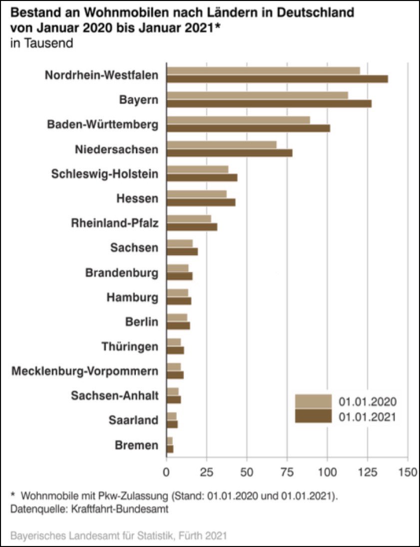 (ty) Sowohl bayernweit, als auch im gesamten Bundesgebiet ist die Zahl der Wohnmobile im vergangenen Jahr stark gestiegen. Nach den Ergebnissen der Fahrzeug-Statistik des Kraftfahrt-Bundesamts legte der Bestand an Wohnmobilen in Bayern zum Stichtag 1. Januar 2021 auf 127 660 zu. Wie das bayerische Landesamt für Statistik jetzt weiter mitteilte, stieg deren Zahl damit innerhalb eines Jahres um fast 14 600 Fahrzeuge oder 12,9 Prozent, im Zehn-Jahres-Vergleich verdoppelte sie sich nahezu. In Deutschland insgesamt nahm der Bestand innerhalb eines Jahres um 14,5 Prozent oder mehr als 85 300 Fahrzeuge zu: von 589 355 auf 674 697 Wohnmobile.