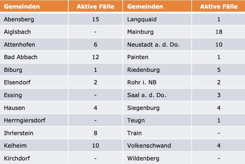(ty) Im Kreis Kelheim gibt es in Zusammenhang mit der Corona-Pandemie ein weiteres Menschenleben zu beklagen. Wie das Landratsamt heute mitteilte, ist eine mit dem Virus infizierte Frau (Jahrgang 1972) gestorben, die nicht an Vorerkrankungen litt. Damit erhöht sich die Zahl der mit dem Corona-Virus infizierten Landkreis-Bürger, die gestorben sind, auf nunmehr 107. Die weitere Situation stellt sich wie folgt dar: Unter Verweis auf Daten des Gesundheitsamts teilte das Landratsamt heute mit, dass – Stand gestern, 16 Uhr – die Zahl der im Kreis Kelheim positiv auf den neuartigen Erreger getesteten Menschen bei insgesamt 5997 liegt – das sind 13 mehr als gestern gemeldet. Insgesamt 5783 hiesige Corona-Patienten (gestern: 5761) wurden wieder aus der Quarantäne entlassen und gelten als genesen. Derzeit gebe es 107 aktive Corona-Fälle im Landkreis (gestern: 117). Zahlen aus den einzelnen Gemeinden zeigt die Tabelle unten. Mittlerweile gelten deutliche Lockerungen der Corona-Regeln.