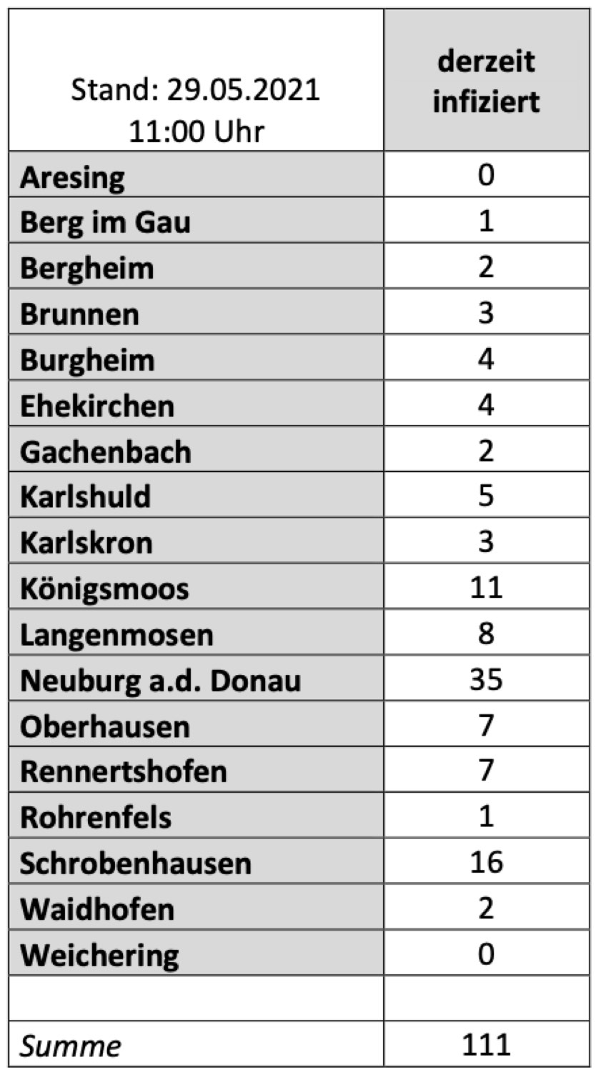 (ty) Im Kreis Neuburg-Schrobenhausen gibt es in Zusammenhang mit der Corona-Pandemie ein weiteres Menschenleben zu beklagen. Wie das Landratsamt heute gegenüber unserer Redaktion mitteilte, ist ein Mann im Alter von über 75 Jahren, der mit dem Virus infiziert war, gestorben. Damit erhöht sich die Zahl der mit dem Erreger infizierten Landkreis-Bürger, die gestorben sind, auf nunmehr 77. Die weitere Situation in dem Kreis stellt sich nach aktuellen Angaben des Landratsamts wie folgt dar: Bislang – Stand: heute, 11 Uhr – wurden 4118 Landkreis-Bürger positiv auf den neuartigen Erreger getestet. Die Zahl hat sich seit der gestrigen Meldung um vier erhöht. Von den Infizierten gelten mittlerweile 3930 als genesen – das sind 14 mehr als gestern. Momentan gibt es im Landkreis 111 aktive Corona-Fälle (gestern: 122). Aktuelle Zahlen aus den Gemeinden zeigt die Tabelle unten. Inzidenz-bedingt wurden die Regeln im Landkreis mittlerweile deutlich gelockert; zudem durften Außen-Gastronomie, Kinos und Theater wieder öffnen.