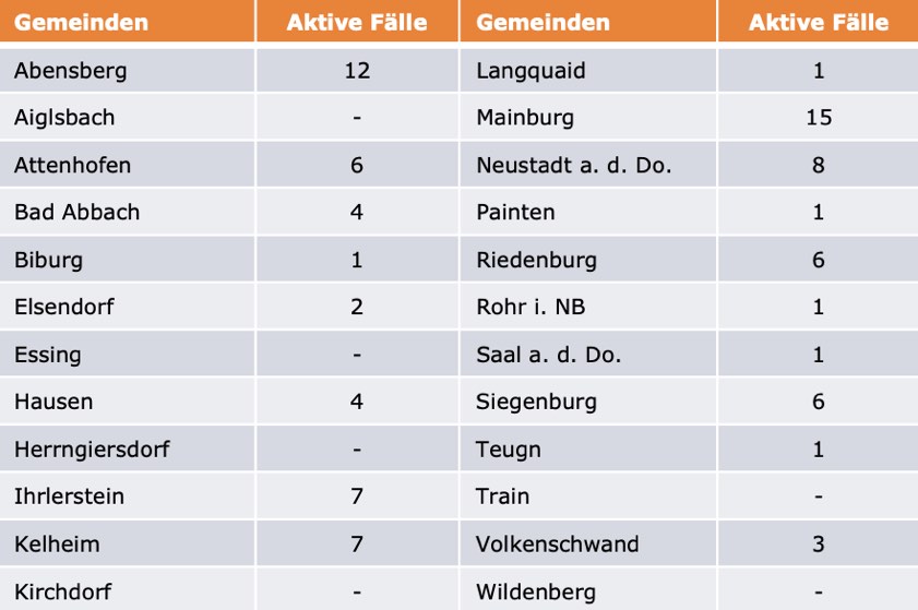 (ty) Im Kreis Kelheim gibt es in Zusammenhang mit der Corona-Pandemie, wie berichtet, mittlerweile 107 Menschenleben zu beklagen. Die weitere Situation stellt sich wie folgt dar: Unter Verweis auf Daten des Gesundheitsamts teilte das Landratsamt heute mit, dass – Stand gestern, 16 Uhr – die Zahl der im Kreis Kelheim positiv auf den neuartigen Erreger getesteten Menschen bei insgesamt 6003 liegt – das ist einer mehr als gestern gemeldet. Insgesamt 5810 hiesige Corona-Patienten (gestern: 5799) wurden wieder aus der Quarantäne entlassen und gelten als genesen. Derzeit gebe es 86 aktive Corona-Fälle im Landkreis (gestern: 96). Zahlen aus den einzelnen Gemeinden zeigt die Tabelle unten. Mittlerweile gelten massive Lockerungen der Corona-Regeln.