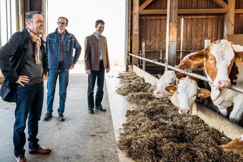 Bürgermeister Thomas Herker (von links), Landwirt Vitus Ostermair, Christian Wagner von der Molkerei und Landwirt Daniel Birgmair.