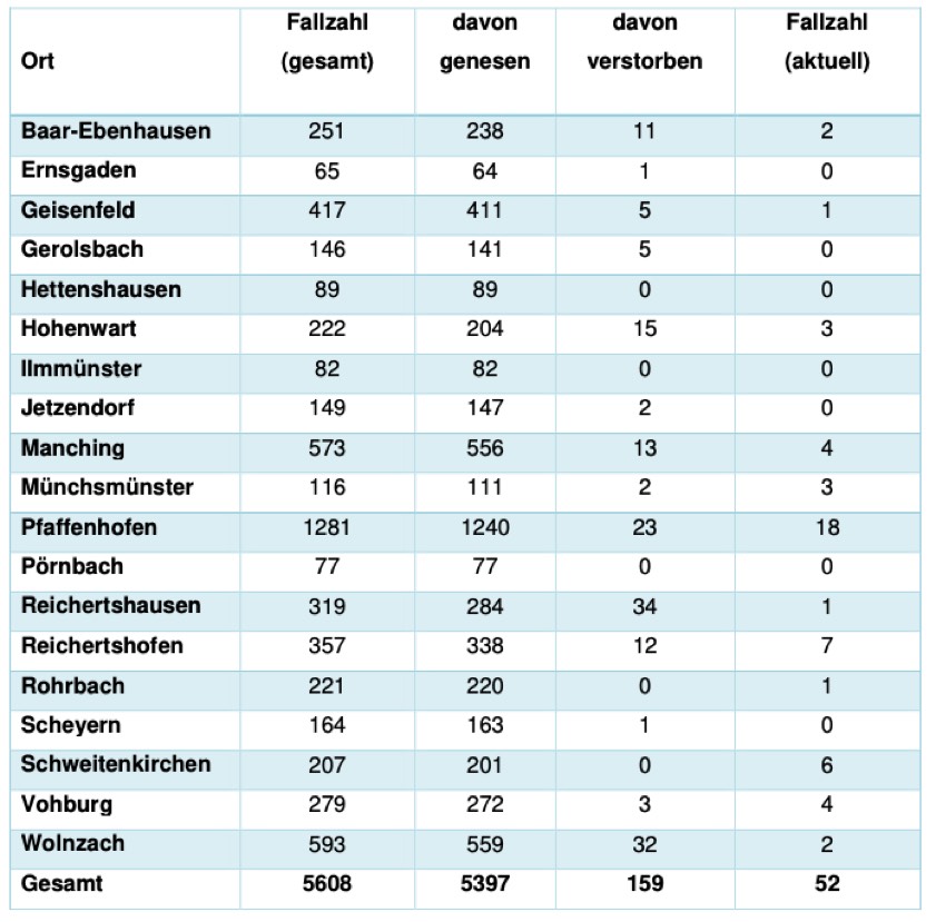 (ty) In Zusammenhang mit der Corona-Pandemie gibt es im Kreis Pfaffenhofen, wie berichtet, mittlerweile 159 Menschenleben zu beklagen. Das Landratsamt veröffentlicht eine tägliche Übersicht (Tabelle unten), in welchen Gemeinden die mit dem Virus infizierten Menschen, die gestorben sind, gelebt haben beziehungsweise wie viele bestätigte Infektionsfälle und genesene Patienten es in welcher Kommune gibt. Die Zahl der Landkreis-Bürger, die positiv auf den neuartigen Erreger getestet worden sind, hat sich seit der Meldung von gestern um zwei erhöht und beträgt somit 5608. Die Corona-Notbremse wurde hier ab 18. Mai aufgehoben, es gab massive Lockerungen. Zudem gelten seit 19. Mai weitere Öffnungen, etwa für Außen-Gastro und Kinos. Zusätzliche Erleichterungen ab 21. Mai betreffen Freibäder, Fitness-Studios und Veranstaltungen. Seit 26. Mai geht Shoppen wieder ohne Termin und ohne Test. Weitere Lockerungen griffen ab 27. Mai für Außen-Gastro, Kino, Fitness-Studios, Events und Sport; ab 1. Juni wurden die Kontakt-Beschränkungen gelockert. (Details siehe unten).