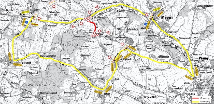 Während der Bauzeit werde der Verkehr aus Nandlstadt kommend ab der Abzweigung Richtung Oberappersdorf über die Kreisstraße FS10, Oberappersdorf, die Kreisstraße FS16 Bergen, Kreisstraße FS35 Sixthaselbach, Kreisstraße FS28 Wang, die Staatsstraße 2085 in Richtung Mauern und die Kreisstraße FS28 wieder zurück nach Altfalterbach umgeleitet. Gegenläufig dazu werde der Verkehr aus der Gegenrichtung geleitet. Die Umleitung werde ausgeschildert. (Grafik: Landratsamt)