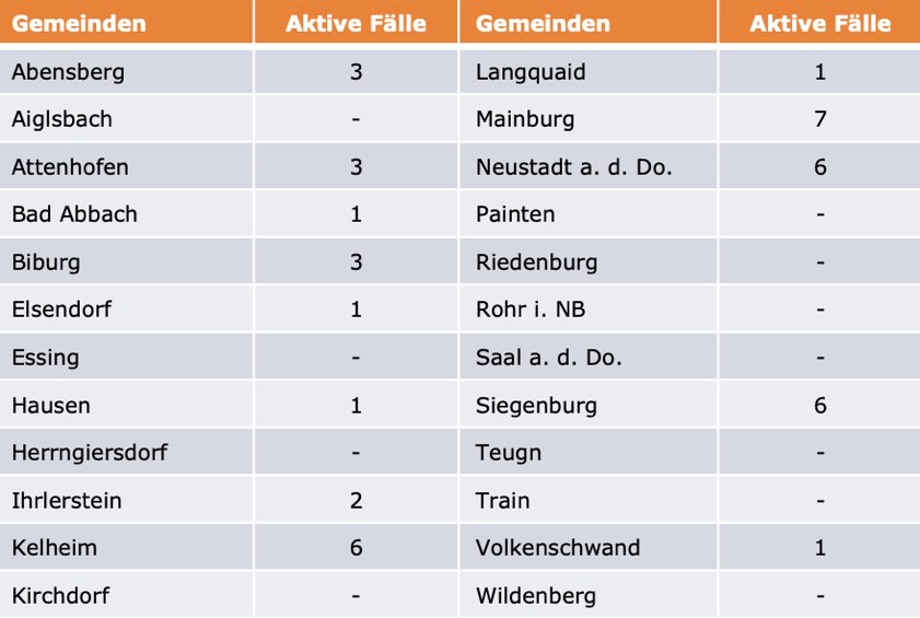 (ty) Im Kreis Kelheim gibt es in Zusammenhang mit der Corona-Pandemie, wie berichtet, mittlerweile 107 Menschenleben zu beklagen. Die weitere Situation stellt sich wie folgt dar: Unter Verweis auf Daten des Gesundheitsamts teilte das Landratsamt heute mit, dass – Stand gestern, 16 Uhr – die Zahl der im Kreis Kelheim positiv auf den neuartigen Erreger getesteten Menschen bei insgesamt 6016 liegt – unverändert seit der gestrigen Meldung. Insgesamt 5868 hiesige Corona-Patienten (gestern: 5859) wurden wieder aus der Quarantäne entlassen und gelten als genesen. Derzeit gebe es 41 aktive Corona-Fälle im Landkreis (gestern: 50). Zahlen aus den einzelnen Gemeinden zeigt die Tabelle unten. Mittlerweile gelten massive Lockerungen der Corona-Regeln.
