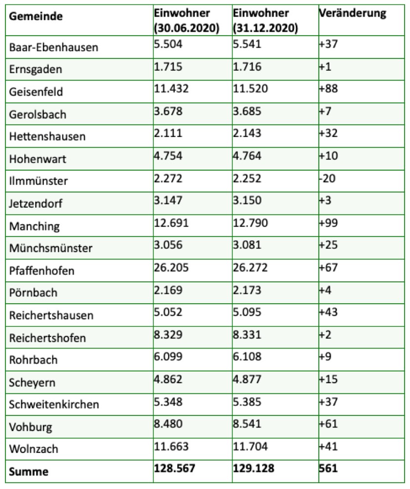 Nach absoluten Zahlen gab es im Markt Manching (plus 99) und in der Stadt Geisenfeld (plus 88) im zweiten Halbjahr 2020 den stärksten Einwohner-Zuwachs; dahinter rangieren die Stadt Pfaffenhofen (plus 67) und die Stadt Vohburg (plus 61). Den Daten zufolge verbuchte nur Ilmmünster (minus 20 Einwohner) einen Rückgang, alle anderen 18 Kommunen verzeichneten einen Einwohner-Zuwachs. Am geringsten fiel dieser in Ernsgaden (plus eins), Reichertshofen (plus zwei), Jetzendorf (plus drei) und Pörnbach (plus vier) aus.