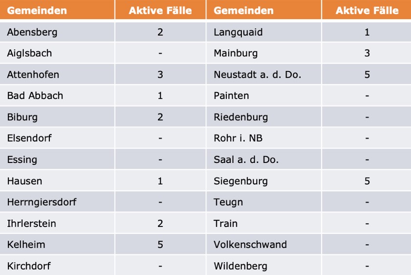 (ty) Im Kreis Kelheim gibt es in Zusammenhang mit der Corona-Pandemie, wie berichtet, mittlerweile 107 Menschenleben zu beklagen. Die weitere Situation stellt sich wie folgt dar: Unter Verweis auf Daten des Gesundheitsamts teilte das Landratsamt heute mit, dass – Stand gestern, 16 Uhr – die Zahl der im Kreis Kelheim positiv auf den neuartigen Erreger getesteten Menschen bei insgesamt 6016 liegt – unverändert seit der gestrigen Meldung. Insgesamt 5879 hiesige Corona-Patienten (gestern: 5868) wurden wieder aus der Quarantäne entlassen und gelten als genesen. Derzeit gebe es 30 aktive Corona-Fälle im Landkreis (gestern: 41). Zahlen aus den einzelnen Gemeinden zeigt die Tabelle unten.