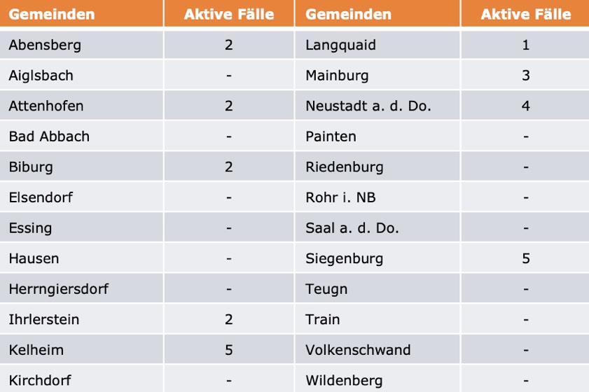 (ty) Im Kreis Kelheim gibt es in Zusammenhang mit der Corona-Pandemie, wie berichtet, mittlerweile 107 Menschenleben zu beklagen. Die weitere Situation stellt sich wie folgt dar: Unter Verweis auf Daten des Gesundheitsamts teilte das Landratsamt heute mit, dass – Stand gestern, 16 Uhr – die Zahl der im Kreis Kelheim positiv auf den neuartigen Erreger getesteten Menschen bei insgesamt 6017 liegt – einer mehr als gestern. Insgesamt 5884 hiesige Corona-Patienten (gestern: 5879) wurden wieder aus der Quarantäne entlassen und gelten als genesen. Derzeit gebe es 26 aktive Corona-Fälle im Landkreis (gestern: 30). Zahlen aus den einzelnen Gemeinden zeigt die Tabelle unten.