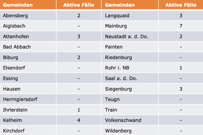 (ty) Im Kreis Kelheim gibt es in Zusammenhang mit der Corona-Pandemie, wie berichtet, mittlerweile 107 Menschenleben zu beklagen. Die weitere Situation stellt sich wie folgt dar: Unter Verweis auf Daten des Gesundheitsamts teilte das Landratsamt heute mit, dass – Stand gestern, 16 Uhr – die Zahl der im Kreis Kelheim positiv auf den neuartigen Erreger getesteten Menschen bei insgesamt 6029 liegt – das sind vier mehr als gestern. Insgesamt 5894 hiesige Corona-Patienten (gestern: 5890) wurden wieder aus der Quarantäne entlassen und gelten als genesen. Derzeit gebe es 28 aktive Corona-Fälle im Landkreis (gestern: 28). Zahlen aus den einzelnen Gemeinden zeigt die Tabelle unten.