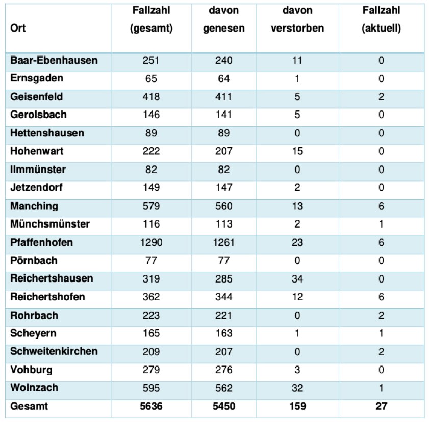 (ty) In Zusammenhang mit der Corona-Pandemie gibt es im Kreis Pfaffenhofen, wie berichtet, mittlerweile 159 Menschenleben zu beklagen. Das Landratsamt veröffentlicht eine tägliche Übersicht (Tabelle unten), in welchen Gemeinden die mit dem Virus infizierten Menschen, die gestorben sind, gelebt haben beziehungsweise wie viele bestätigte Infektionsfälle und genesene Patienten es in welcher Kommune gibt. Die Zahl der Landkreis-Bürger, die positiv auf den neuartigen Erreger getestet worden sind, hat sich seit der Meldung von gestern um eins erhöht und beträgt somit jetzt 5636.