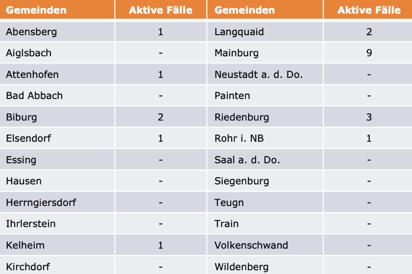 (ty) Im Kreis Kelheim gibt es in Zusammenhang mit der Corona-Pandemie zwei weitere Menschenleben zu beklagen. Wie das Landratsamt gegenüber unserer Redaktion mitteilte, sind zwei mit dem Virus infizierte Frauen (Jahrgang 1930 und 1934) gestorben, die unter Vorerkrankungen litten. Damit erhöht sich die Zahl der infizierten Landkreis-Bürger, die gestorben sind, auf 109. Die weitere Situation stellt sich wie folgt dar: Unter Verweis auf Daten des Gesundheitsamts teilte das Landratsamt heute mit, dass – Stand gestern, 16 Uhr – die Zahl der im Kreis Kelheim positiv auf den neuartigen Erreger getesteten Menschen bei insgesamt 6036 liegt – das sind sieben mehr als am Freitag gemeldet. Insgesamt 5906 hiesige Corona-Patienten (Freitag: 5894) wurden wieder aus der Quarantäne entlassen und gelten als genesen. Derzeit gebe es 21 aktive Corona-Fälle im Landkreis (Freitag: 28). Zahlen aus den einzelnen Gemeinden zeigt die Tabelle unten.