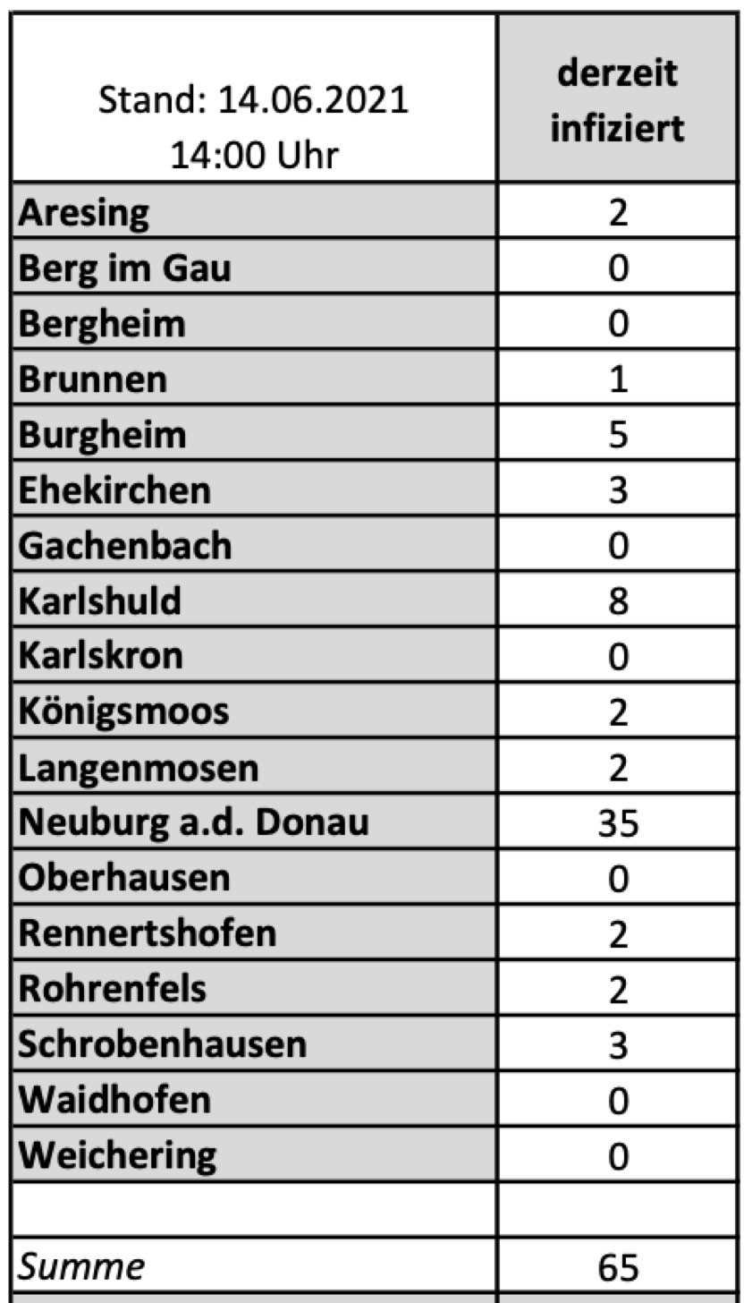 (ty) Im Kreis Neuburg-Schrobenhausen gibt es in Zusammenhang mit der Corona-Pandemie, wie berichtet, mittlerweile 80 Menschenleben zu beklagen. Die weitere Situation in dem Kreis stellt sich nach aktuellen Angaben des Landratsamts wie folgt dar: Bislang – Stand: heute, 14 Uhr – wurden 4167 Landkreis-Bürger positiv auf den neuartigen Erreger getestet. Die Zahl hat sich seit der gestrigen Meldung nicht weiter erhöht. Von den Infizierten gelten mittlerweile 4022 als genesen – zwei mehr als gestern. Momentan gibt es im Landkreis also 65 aktive Corona-Fälle (gestern: 67). Aktuelle Zahlen aus den Gemeinden zeigt die Tabelle unten.
