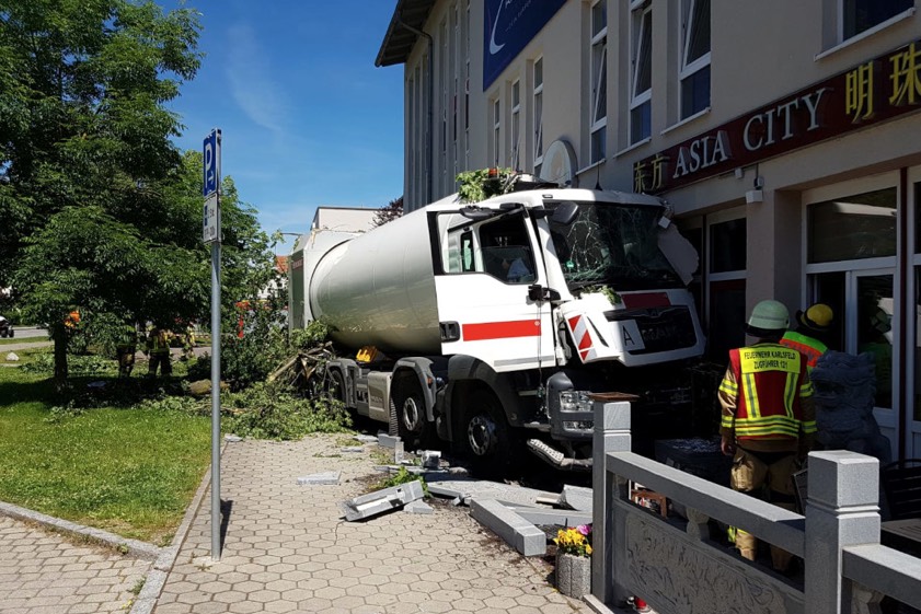 (ty) Ein Aufsehen erregender und schadensträchtiger Verkehrsunfall hat sich am gestrigen Vormittag in Karlsfeld im Landkreis Dachau ereignet. Laut Polizei wurde dem 41 Jahre alten Lenker eines Müll-Lastwagens gegen 11 Uhr während der Fahrt auf der Münchner Straße schwarz vor Augen. Der Mann aus Mammendorf habe das Bewusstsein verloren, sein Fuß sei wohl auf dem Gaspedal geblieben. Der Lkw kam jedenfalls nach links von der Strecke ab, fuhr über die Mittelinsel, die Gegenspur und durch einen Grünstreifen, ehe er in die Fassade eines Asia-Restaurants krachte.