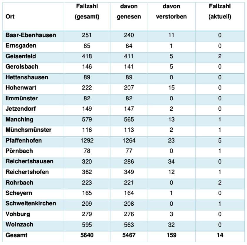 (ty) In Zusammenhang mit der Corona-Pandemie gibt es im Kreis Pfaffenhofen, wie berichtet, mittlerweile 159 Menschenleben zu beklagen. Das Landratsamt veröffentlicht eine tägliche Übersicht (Tabelle unten), in welchen Gemeinden die mit dem Virus infizierten Menschen, die gestorben sind, gelebt haben beziehungsweise wie viele bestätigte Infektionsfälle und genesene Patienten es in welcher Kommune gibt. Die Zahl der Landkreis-Bürger, die positiv auf den neuartigen Erreger getestet worden sind, hat sich seit der Meldung von gestern nicht weiter erhöht und beträgt somit 5640.