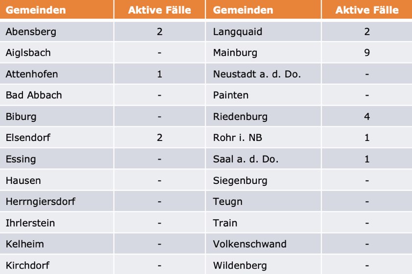 (ty) Im Kreis Kelheim gibt es in Zusammenhang mit der Corona-Pandemie, wie berichtet, mittlerweile 109 Menschenleben zu beklagen. Die weitere Situation stellt sich wie folgt dar: Unter Verweis auf Daten des Gesundheitsamts teilte das Landratsamt heute mit, dass – Stand gestern, 16 Uhr – die Zahl der im Kreis Kelheim positiv auf den neuartigen Erreger getesteten Menschen bei insgesamt 6040 liegt – drei mehr als gestern gemeldet. Insgesamt 5909 hiesige Corona-Patienten (gestern: 5907) wurden wieder aus der Quarantäne entlassen und gelten als genesen. Derzeit gebe es 22 aktive Corona-Fälle im Landkreis (gestern: 21). Zahlen aus den einzelnen Gemeinden zeigt die Tabelle unten.