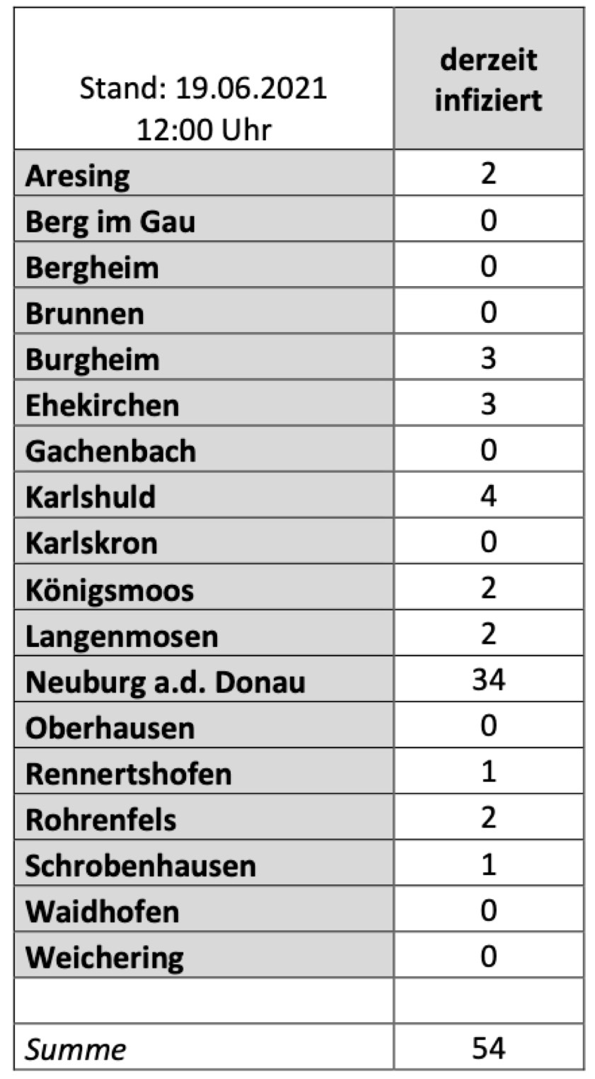 (ty) Im Kreis Neuburg-Schrobenhausen gibt es in Zusammenhang mit der Corona-Pandemie, wie berichtet, mittlerweile 80 Menschenleben zu beklagen. Die weitere Situation in dem Kreis stellt sich nach aktuellen Angaben des Landratsamts wie folgt dar: Bislang – Stand: heute, 12 Uhr – wurden 4172 Landkreis-Bürger positiv auf den neuartigen Erreger getestet. Die Zahl hat sich seit der gestrigen Meldung um einen erhöht. Von den Infizierten gelten mittlerweile 4038 als genesen – das ist einer mehr als gestern. Momentan gibt es im Landkreis also 54 aktive Corona-Fälle (gestern: 54). Aktuelle Zahlen aus den Gemeinden zeigt die Tabelle unten.