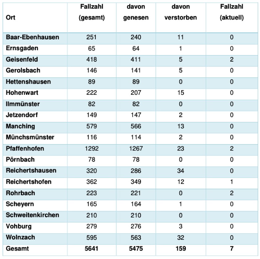 (ty) In Zusammenhang mit der Corona-Pandemie gibt es im Kreis Pfaffenhofen, wie berichtet, mittlerweile 159 Menschenleben zu beklagen. Das Landratsamt veröffentlicht eine tägliche Übersicht (Tabelle unten), in welchen Gemeinden die mit dem Virus infizierten Menschen, die gestorben sind, gelebt haben beziehungsweise wie viele bestätigte Infektionsfälle und genesene Patienten es in welcher Kommune gibt. Die Zahl der Landkreis-Bürger, die positiv auf den neuartigen Erreger getestet worden sind, hat sich seit der Meldung von Freitag nicht weiter erhöht und beträgt somit 5641.