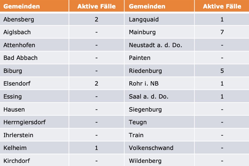 (ty) Im Kreis Kelheim gibt es in Zusammenhang mit der Corona-Pandemie, wie berichtet, mittlerweile 109 Menschenleben zu beklagen. Die weitere Situation stellt sich wie folgt dar: Unter Verweis auf Daten des Gesundheitsamts teilte das Landratsamt heute mit, dass – Stand gestern, 16 Uhr – die Zahl der im Kreis Kelheim positiv auf den neuartigen Erreger getesteten Menschen bei insgesamt 6042 liegt – einer mehr als am Freitag gemeldet. Insgesamt 5913 hiesige Corona-Patienten (Freitag: 5911) wurden wieder aus der Quarantäne entlassen und gelten als genesen. Derzeit gebe es 20 aktive Corona-Fälle im Landkreis (Freitag: 21). Zahlen aus den einzelnen Gemeinden zeigt die Tabelle unten.