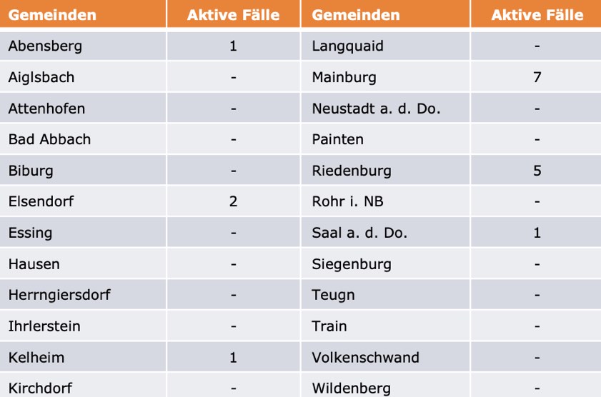 (ty) Im Kreis Kelheim gibt es in Zusammenhang mit der Corona-Pandemie, wie berichtet, mittlerweile 109 Menschenleben zu beklagen. Die weitere Situation stellt sich wie folgt dar: Unter Verweis auf Daten des Gesundheitsamts teilte das Landratsamt heute mit, dass – Stand gestern, 16 Uhr – die Zahl der im Kreis Kelheim positiv auf den neuartigen Erreger getesteten Menschen bei insgesamt 6042 liegt – unverändert seit gestern. Insgesamt 5916 hiesige Corona-Patienten (gestern: 5914) wurden wieder aus der Quarantäne entlassen und gelten als genesen. Derzeit gebe es 17 aktive Corona-Fälle im Landkreis (gestern: 19). Zahlen aus den einzelnen Gemeinden zeigt die Tabelle unten.