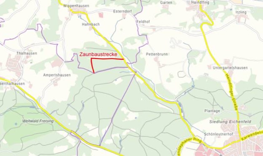 (ty) Zur Vorbereitung auf einen möglichen Ausbruch der so genannten Afrikanischen Schweinepest (ASP) im Freistaat findet am kommenden Samstag, 26. Juni, eine vom bayerische Landesamt für Gesundheit und Lebensmittel-Sicherheit (LGL) und dem Veterinäramt des Landkreises Freising organisierte Übung zur Errichtung eines Elektro-Zaunes statt. Bei der Aktion wird nach Angaben des Landratsamts ein Zaun durch das Technische Hilfswerk (THW) und die bayerischen Staatsforsten (BaySF) im Bereich des Staatsforstes zwischen Freising und Wippenhausen errichtet (siehe Karte unten).
