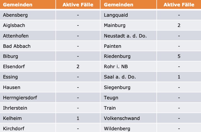 (ty) Im Kreis Kelheim gibt es in Zusammenhang mit der Corona-Pandemie, wie berichtet, mittlerweile 109 Menschenleben zu beklagen. Die weitere Situation stellt sich wie folgt dar: Unter Verweis auf Daten des Gesundheitsamts teilte das Landratsamt heute mit, dass – Stand gestern, 16 Uhr – die Zahl der im Kreis Kelheim positiv auf den neuartigen Erreger getesteten Menschen bei insgesamt 6042 liegt – unverändert seit gestern. Insgesamt 5922 hiesige Corona-Patienten (gestern: 5921) wurden wieder aus der Quarantäne entlassen und gelten als genesen. Derzeit gebe es elf aktive Corona-Fälle im Landkreis (gestern: zwölf). Zahlen aus den einzelnen Gemeinden zeigt die Tabelle unten.