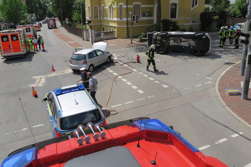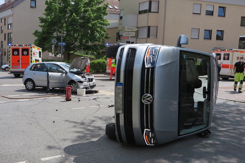 Zum Unfall-Zeitpunkt war die Ampel-Anlage an der Kreuzung nicht in Betrieb. Laut Polizei war eine 27-Jährige mit einem VW-Bus auf der Prinz-Ludwig-Straße in nördlicher Richtung unterwegs, missachtete das für sie geltende "Stop"-Schild und fuhr in den Kreuzungs-Bereich ein. Dabei habe sie den von einer 34-Jährigen gesteuerten VW-Polo übersehen, der auf der Alois-Steinecker-Straße in westlicher Richtung unterwegs war und Vorfahrt hatte. Der Kleinwagen der 34-Jährigen krachte laut Schilderung der örtlichen Polizeiinspektion frontal in die Beifahrerseite des VW-Busses, der dadurch zur Seite kippte und so liegen blieb.