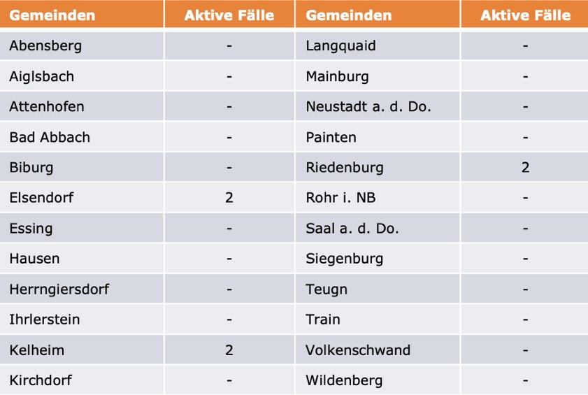 (ty) Im Kreis Kelheim gibt es in Zusammenhang mit der Corona-Pandemie, wie berichtet, mittlerweile 109 Menschenleben zu beklagen. Die weitere Situation stellt sich wie folgt dar: Unter Verweis auf Daten des Gesundheitsamts teilte das Landratsamt heute mit, dass – Stand gestern, 16 Uhr – die Zahl der im Kreis Kelheim positiv auf den neuartigen Erreger getesteten Menschen bei insgesamt 6044 liegt – einer mehr als gestern. "Erstmals wurde im Landkreis Kelheim bei einer infizierten Person die so genannte Delta-Variante des Corona-Virus nachgewiesen", hieß es gestern. Insgesamt 5929 hiesige Corona-Patienten (gestern: 5929) wurden wieder aus der Quarantäne entlassen und gelten als genesen. Derzeit gebe es sechs aktive Corona-Fälle im Landkreis (gestern: fünf). Zahlen aus den einzelnen Gemeinden zeigt die Tabelle unten.