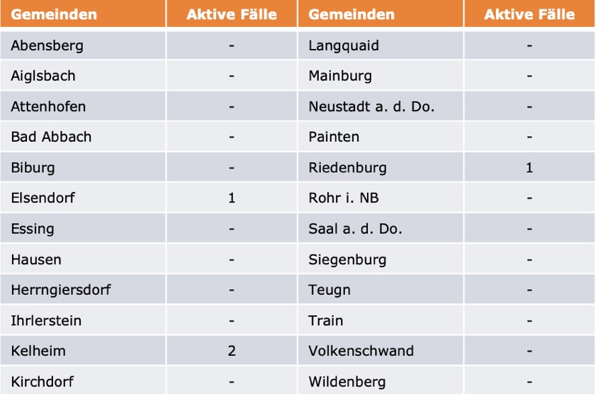 (ty) Im Kreis Kelheim gibt es in Zusammenhang mit der Corona-Pandemie, wie berichtet, mittlerweile 109 Menschenleben zu beklagen. Die weitere Situation stellt sich wie folgt dar: Unter Verweis auf Daten des Gesundheitsamts teilte das Landratsamt heute mit, dass – Stand gestern, 16 Uhr – die Zahl der im Kreis Kelheim positiv auf den neuartigen Erreger getesteten Menschen bei insgesamt 6044 liegt – unverändert seit gestern. Bekanntlich wurde im Landkreis Kelheim auch bereits die so genannte Delta-Variante nachgewiesen. Insgesamt 5931 hiesige Corona-Patienten (gestern: 5929) wurden wieder aus der Quarantäne entlassen und gelten als genesen. Derzeit gebe es vier aktive Corona-Fälle im Landkreis (gestern: sechs). Zahlen aus den einzelnen Gemeinden zeigt die Tabelle unten.