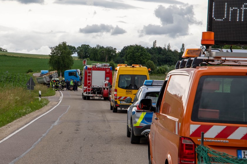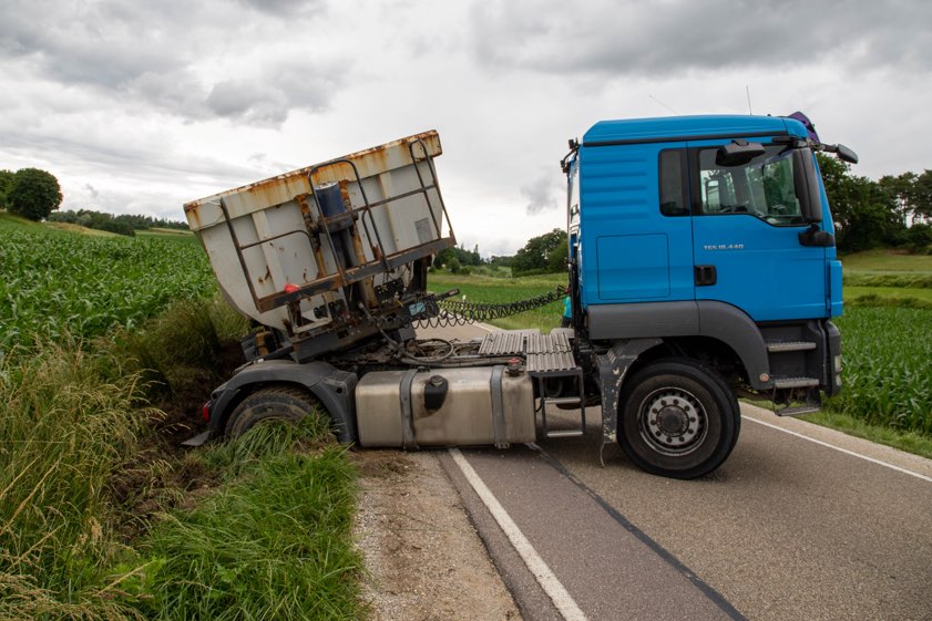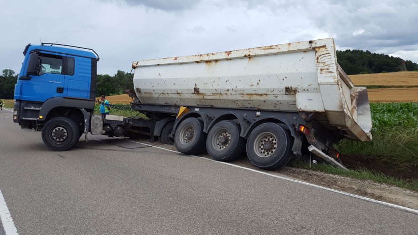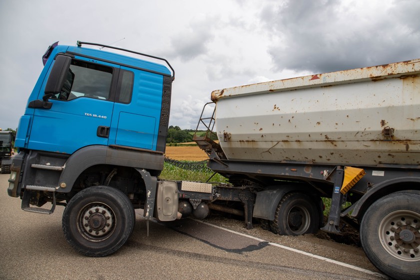 43-Jähriger kam mit Kies-Laster von der Strecke ab. Ursache war angeblich ein anderer Lastwagen. Aufwändige Bergung, stundenlange Sperrung.