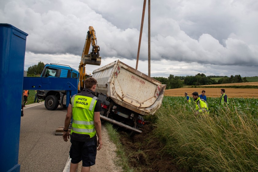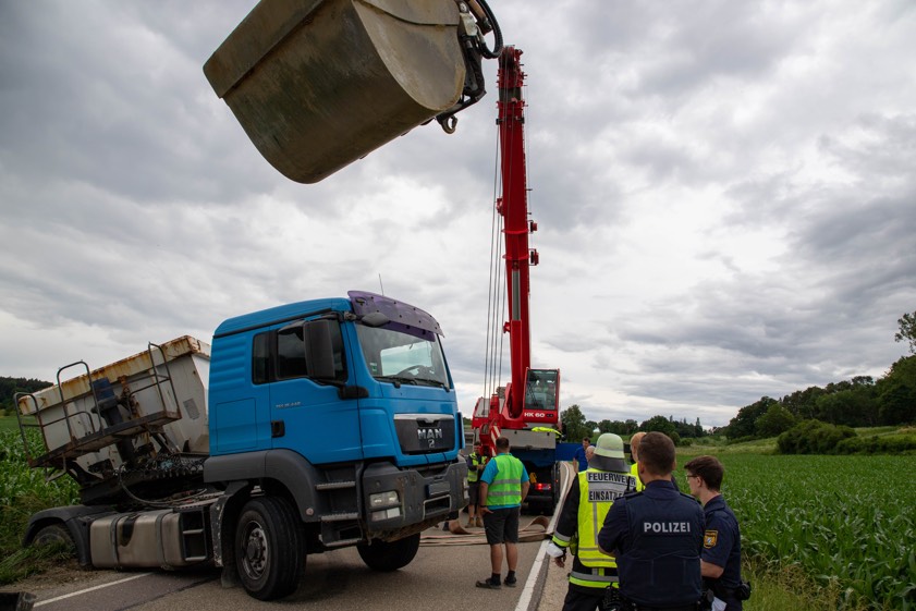 Zur Bergung des festgefahrenen Lkw musste schweres Gerät angefordert worden. Nachdem der Kies umgeladen und der Lastwagen soweit gesichert war, dass die Gefahr auslaufender Betriebsstoffe nicht mehr bestand, konnte der Laster wieder auf den Asphalt gezogen werden. Die Straße war für mehrere Stunden komplett gesperrt. Die Feuerwehren aus Freinhausen und Pörnbach waren im Einsatz, kümmerten sich um die Verkehrs-Maßnahmen. Auch die Straßenbau-Behörde wurde hinzugezogen. Nach der Reparatur des Banketts konnte die Straße in den frühen Abendstunden wieder für den Verkehr freigegeben werden, heißt es von der Polizei.