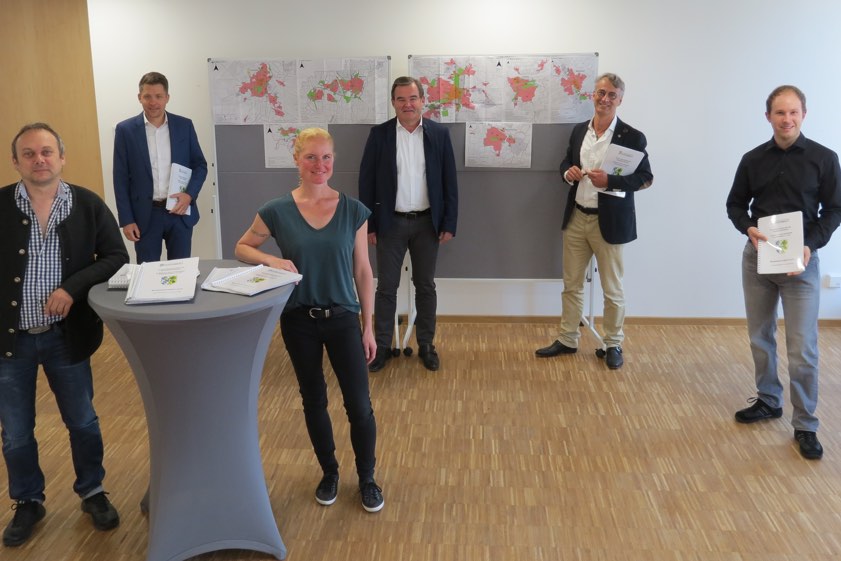 Von links, bei der Vorstellung der neuen Bodenrichtwert-Liste: Edmund Ferstl (Vize-Vorsitzender des Gutachter-Ausschusses), Abteilungsleiter Michael Beckmann, Katharina Walcher (Geschäftsstelle Gutachter-Ausschuss), Landrat Albert Gürtner, Kreisbaumeister Gunther-F.-L. Hasse (Vorsitzender des Gutachter-Ausschusses) und Benjamin Wolf (Geschäftsstelle Gutachter-Ausschuss). Foto: Rottler