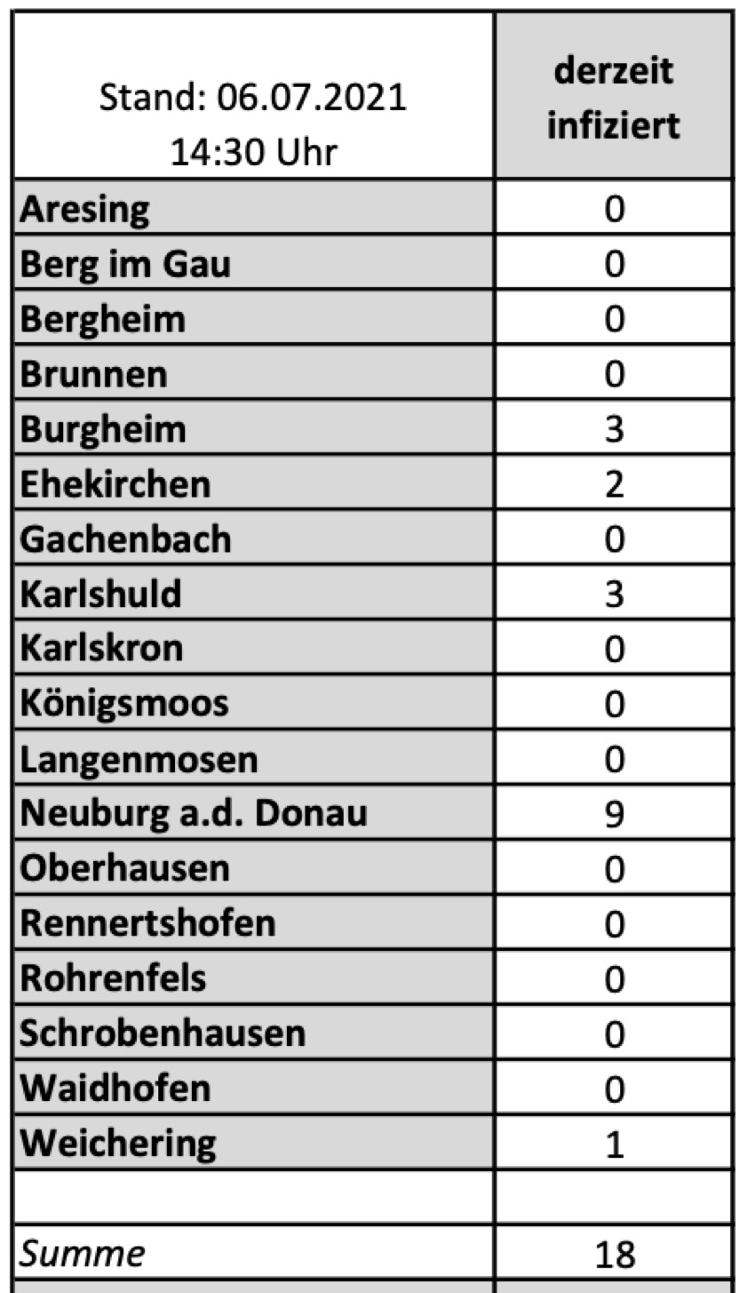 (ty) Im Kreis Neuburg-Schrobenhausen gibt es in Zusammenhang mit der Corona-Pandemie, wie berichtet, mittlerweile 80 Menschenleben zu beklagen. Die weitere Situation in dem Kreis stellt sich nach aktuellen Angaben des Landratsamts wie folgt dar: Bislang – Stand: heute, 14.30 Uhr – wurden 4178 Landkreis-Bürger positiv auf den neuartigen Erreger getestet. Die Zahl hat sich seit gestern nicht weiter erhöht. Von den Infizierten gelten mittlerweile 4080 als genesen – unverändert seit gestern. Momentan gibt es im Landkreis also 18 aktive Corona-Fälle (gestern: 18). Aktuelle Zahlen aus den Gemeinden zeigt die Tabelle unten.