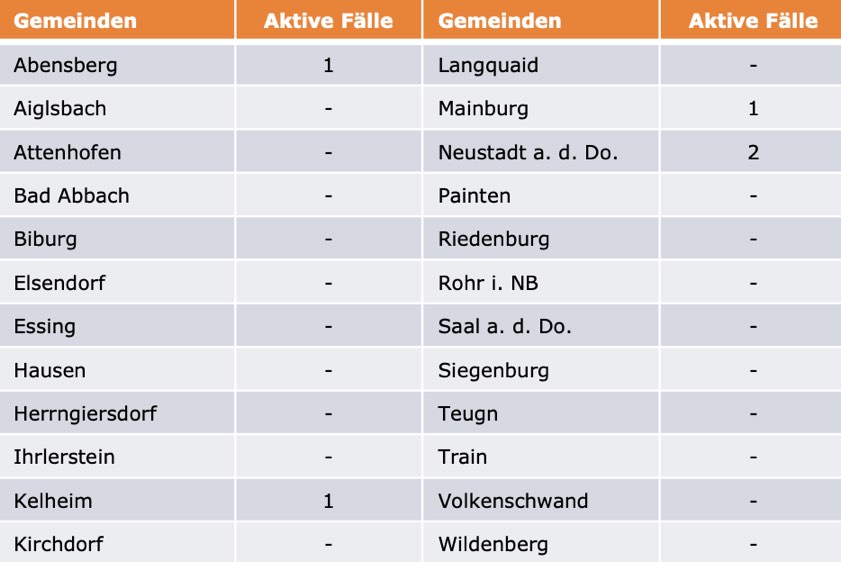 In der Goldberg-Klinik in Kelheim wird laut heutiger Mitteilung des Landratsamts derzeit eine Person (gestern: eine) behandelt, die positiv auf den neuartigen Corona-Virus getestet worden sind. Im Mainburger Krankenhaus gibt es den Angaben zufolge momentan keinen Corona-Patienten (gestern: keinen). Lesen Sie dazu auch: In der Mainburger Klinik sollen keine Corona-Patienten mehr versorgt werden