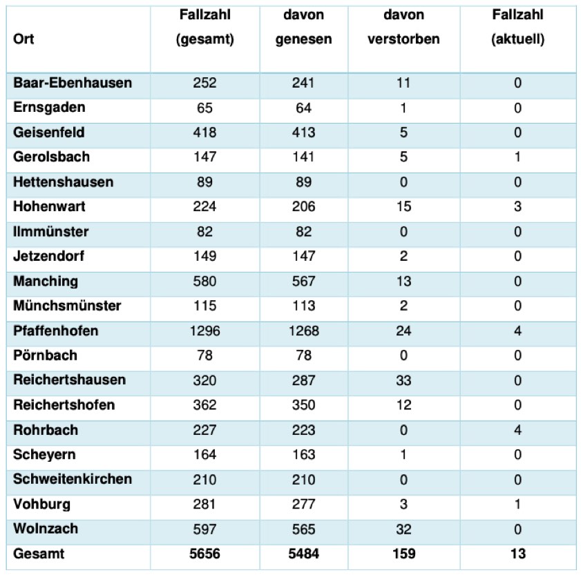 (ty) In Zusammenhang mit der Corona-Pandemie gibt es im Kreis Pfaffenhofen, wie berichtet, mittlerweile 159 Menschenleben zu beklagen. Das Landratsamt veröffentlicht eine tägliche Übersicht (Tabelle unten), in welchen Gemeinden die mit dem Virus infizierten Menschen, die gestorben sind, gelebt haben beziehungsweise wie viele bestätigte Infektionsfälle und genesene Patienten es in welcher Kommune gibt. Die Zahl der Landkreis-Bürger, die positiv auf den neuartigen Erreger getestet worden sind, hat sich seit der Meldung von gestern um drei erhöht und beträgt somit aktuell 5656.