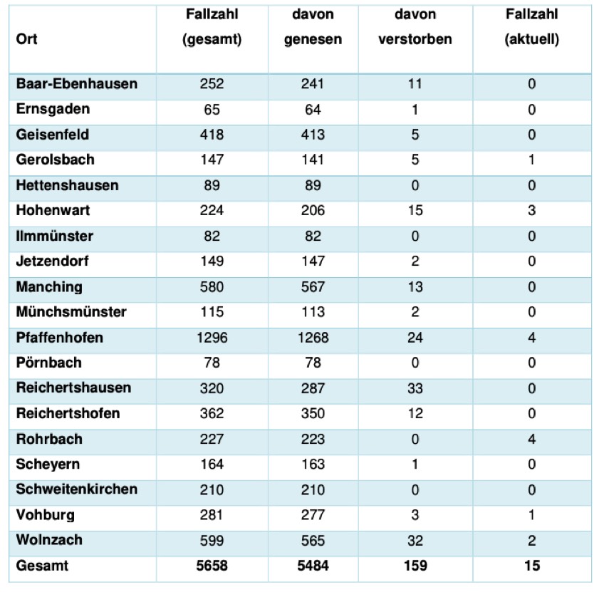 (ty) In Zusammenhang mit der Corona-Pandemie gibt es im Kreis Pfaffenhofen, wie berichtet, mittlerweile 159 Menschenleben zu beklagen. Das Landratsamt veröffentlicht eine tägliche Übersicht (Tabelle unten), in welchen Gemeinden die mit dem Virus infizierten Menschen, die gestorben sind, gelebt haben beziehungsweise wie viele bestätigte Infektionsfälle und genesene Patienten es in welcher Kommune gibt. Die Zahl der Landkreis-Bürger, die positiv auf den neuartigen Erreger getestet worden sind, hat sich seit der Meldung von gestern um zwei erhöht und beträgt somit aktuell 5658.