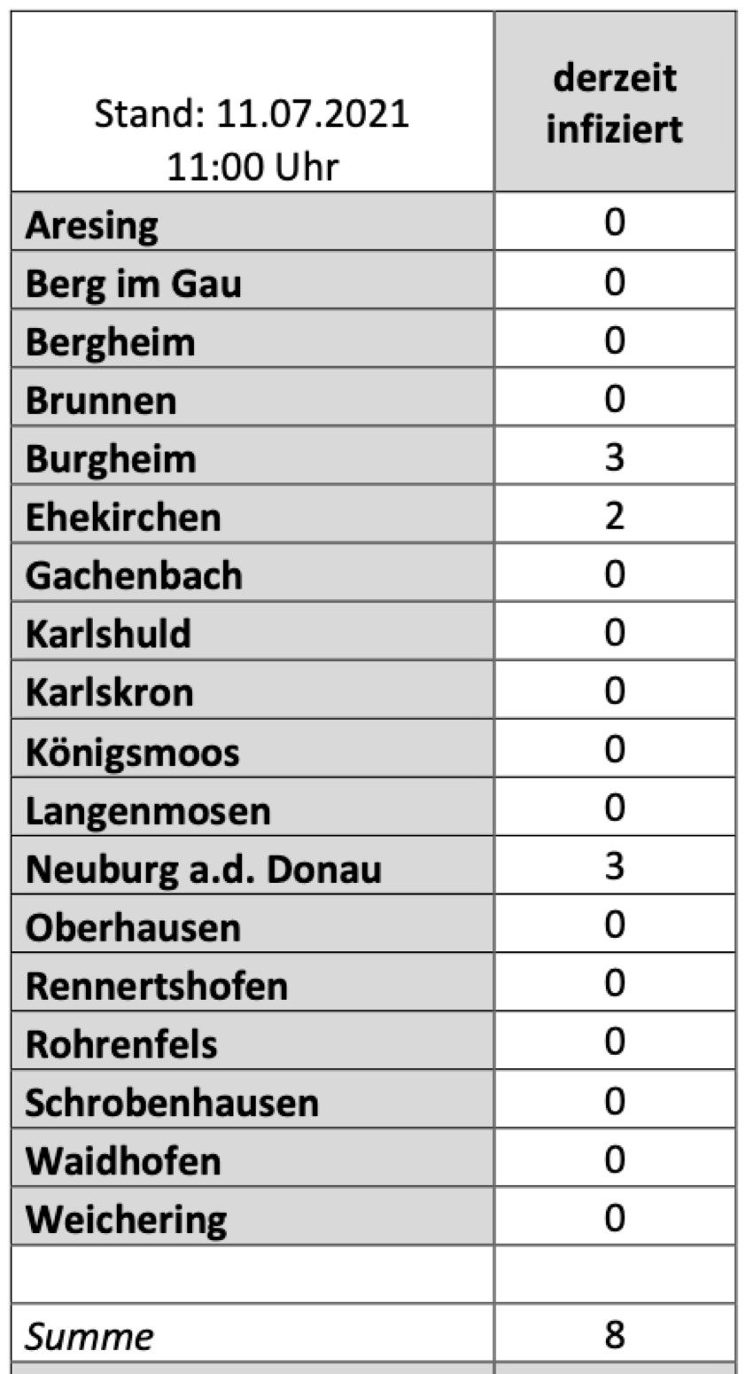 (ty) Im Kreis Neuburg-Schrobenhausen gibt es in Zusammenhang mit der Corona-Pandemie, wie berichtet, mittlerweile 80 Menschenleben zu beklagen. Die weitere Situation in dem Kreis stellt sich nach aktuellen Angaben des Landratsamts wie folgt dar: Bislang – Stand: heute, 11 Uhr – wurden 4178 Landkreis-Bürger positiv auf den neuartigen Erreger getestet. Die Zahl hat sich seit gestern nicht weiter erhöht. Von den Infizierten gelten mittlerweile 4090 als genesen – einer mehr als gestern gemeldet. Momentan gibt es im Landkreis also acht aktive Corona-Fälle (gestern: neun). Aktuelle Zahlen aus den Gemeinden zeigt die Tabelle unten.