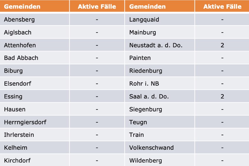 (ty) Im Kreis Kelheim gibt es in Zusammenhang mit der Corona-Pandemie, wie berichtet, mittlerweile 110 Menschenleben zu beklagen. Die weitere Situation stellt sich wie folgt dar: Unter Verweis auf Daten des Gesundheitsamts teilte das Landratsamt heute mit, dass – Stand gestern, 16 Uhr – die Zahl der im Kreis Kelheim positiv auf den neuartigen Erreger getesteten Menschen bei insgesamt 6050 liegt – unverändert seit der gestrigen Meldung. Bekanntlich wurde im Kreis Kelheim auch bereits die so genannte Delta-Variante nachgewiesen. Insgesamt 5936 hiesige Corona-Patienten (gestern: 5935) wurden wieder aus der Quarantäne entlassen und gelten als genesen. Derzeit gebe es vier aktive Corona-Fälle im Landkreis (gestern: fünf). Zahlen aus den einzelnen Gemeinden zeigt die Tabelle unten.