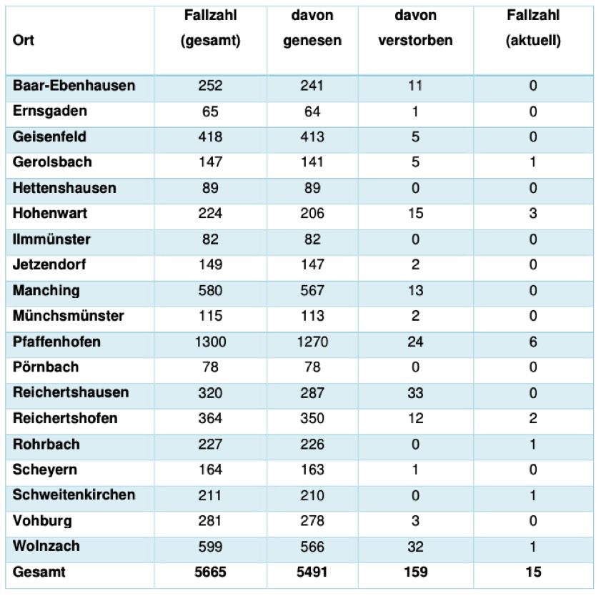 (ty) In Zusammenhang mit der Corona-Pandemie gibt es im Kreis Pfaffenhofen, wie berichtet, mittlerweile 159 Menschenleben zu beklagen. Das Landratsamt veröffentlicht eine tägliche Übersicht (Tabelle unten), in welchen Gemeinden die mit dem Virus infizierten Menschen, die gestorben sind, gelebt haben beziehungsweise wie viele bestätigte Infektionsfälle und genesene Patienten es in welcher Kommune gibt. Die Zahl der Landkreis-Bürger, die positiv auf den neuartigen Erreger getestet worden sind, hat sich seit der Meldung von gestern um vier erhöht und beträgt somit aktuell 5665.