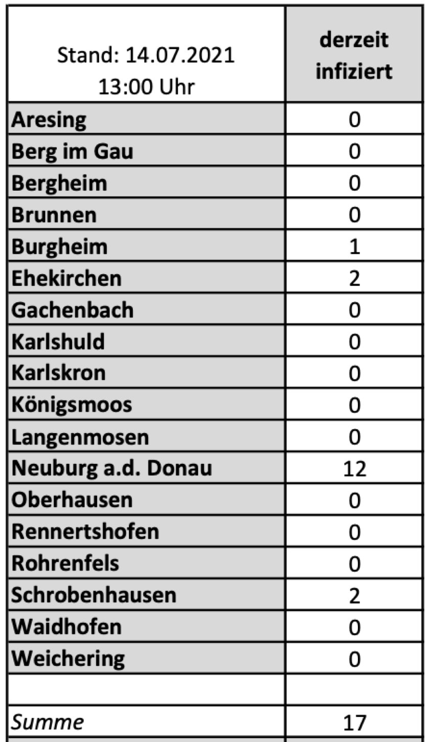 (ty) Im Kreis Neuburg-Schrobenhausen gibt es in Zusammenhang mit der Corona-Pandemie, wie berichtet, mittlerweile 80 Menschenleben zu beklagen. Die weitere Situation in dem Kreis stellt sich nach aktuellen Angaben des Landratsamts wie folgt dar: Bislang – Stand: heute, 13 Uhr – wurden 4189 Landkreis-Bürger positiv auf den neuartigen Erreger getestet. Die Zahl hat sich seit gestern um zwei erhöht. Mittlerweile wurde auch die so genannte Delta-Variante im Landkreis nachgewiesen. Von den Infizierten gelten mittlerweile 4092 als genesen – einer mehr als gestern gemeldet. Momentan gibt es im Landkreis also 17 aktive Corona-Fälle (gestern: 16). Aktuelle Zahlen aus den Gemeinden zeigt die Tabelle unten.