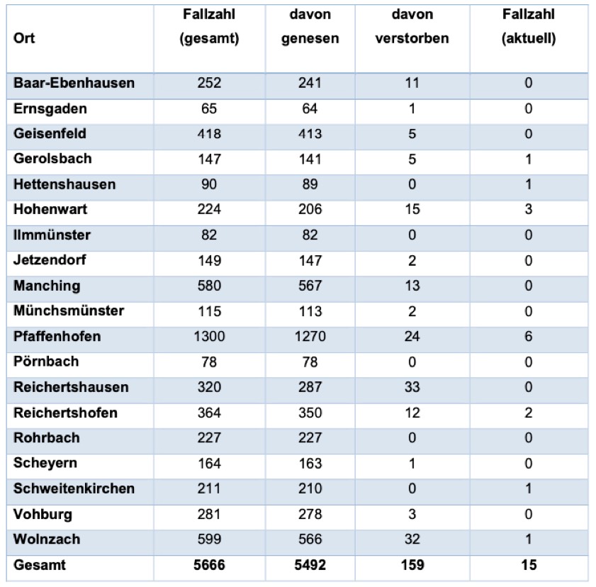 (ty) In Zusammenhang mit der Corona-Pandemie gibt es im Kreis Pfaffenhofen, wie berichtet, mittlerweile 159 Menschenleben zu beklagen. Das Landratsamt veröffentlicht eine tägliche Übersicht (Tabelle unten), in welchen Gemeinden die mit dem Virus infizierten Menschen, die gestorben sind, gelebt haben beziehungsweise wie viele bestätigte Infektionsfälle und genesene Patienten es in welcher Kommune gibt. Die Zahl der Landkreis-Bürger, die positiv auf den neuartigen Erreger getestet worden sind, hat sich seit der Meldung von gestern um einen erhöht und beträgt somit aktuell 5666.