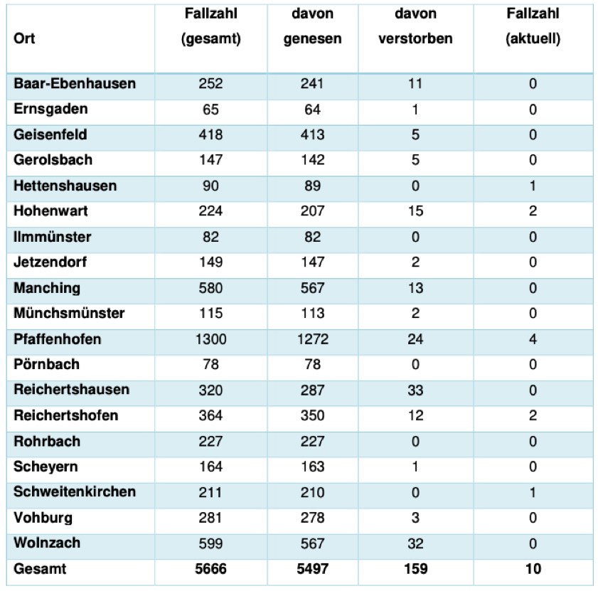 (ty) In Zusammenhang mit der Corona-Pandemie gibt es im Kreis Pfaffenhofen, wie berichtet, mittlerweile 159 Menschenleben zu beklagen. Das Landratsamt veröffentlicht eine tägliche Übersicht (Tabelle unten), in welchen Gemeinden die mit dem Virus infizierten Menschen, die gestorben sind, gelebt haben beziehungsweise wie viele bestätigte Infektionsfälle und genesene Patienten es in welcher Kommune gibt. Die Zahl der Landkreis-Bürger, die positiv auf den neuartigen Erreger getestet worden sind, hat sich seit der Meldung von gestern nicht weiter erhöht und beträgt somit aktuell 5666.