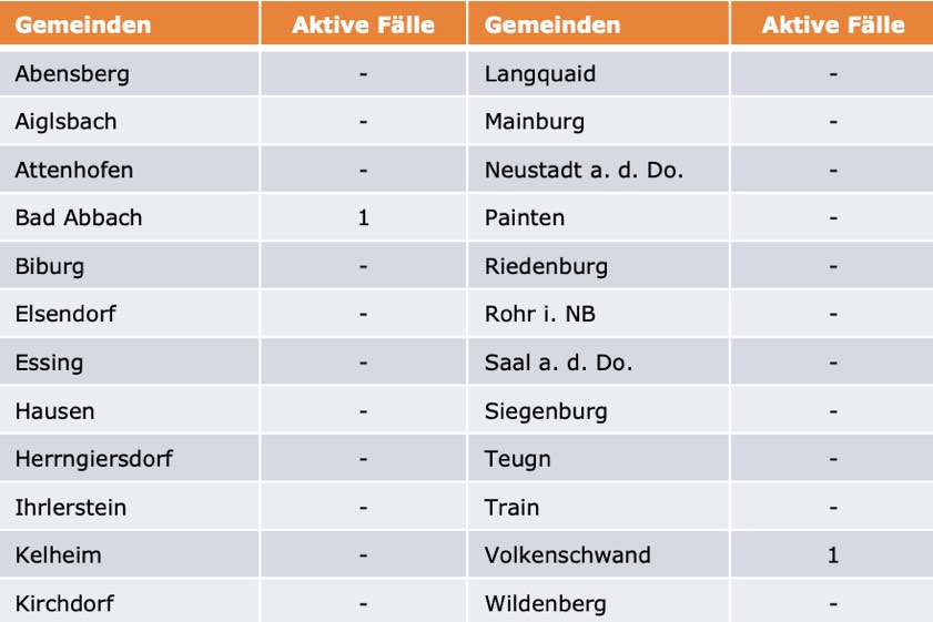 (ty) Im Kreis Kelheim gibt es in Zusammenhang mit der Corona-Pandemie, wie berichtet, mittlerweile 110 Menschenleben zu beklagen. Die weitere Situation stellt sich wie folgt dar: Unter Verweis auf Daten des Gesundheitsamts teilte das Landratsamt heute mit, dass – Stand gestern, 16 Uhr – die Zahl der im Kreis Kelheim positiv auf den neuartigen Erreger getesteten Menschen bei insgesamt 6054 liegt: Einer mehr als am Freitag gemeldet. Bekanntlich wurde im Kreis Kelheim auch bereits die so genannte Delta-Variante nachgewiesen. Insgesamt 5942 hiesige Corona-Patienten (Freitag: 5941) wurden wieder aus der Quarantäne entlassen und gelten als genesen. Derzeit gebe es zwei aktive Corona-Fälle im Landkreis (Freitag: zwei). Zahlen aus den einzelnen Gemeinden zeigt die Tabelle unten.