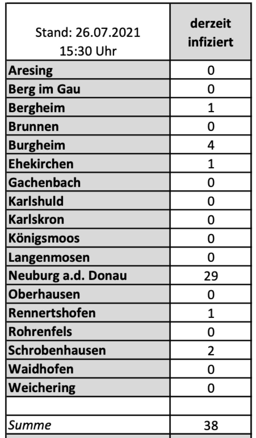 (ty) Im Kreis Neuburg-Schrobenhausen gibt es in Zusammenhang mit der Corona-Pandemie, wie berichtet, mittlerweile 80 Menschenleben zu beklagen. Die weitere Situation in dem Kreis stellt sich nach aktuellen Angaben des Landratsamts wie folgt dar: Bislang – Stand: heute, 15.30 Uhr – wurden 4212 Landkreis-Bürger positiv auf den neuartigen Erreger getestet. Die Zahl hat sich seit der Meldung von gestern nicht erhöht. Mittlerweile wurde bekanntlich auch die so genannte Delta-Variante im Landkreis nachgewiesen. Von den Infizierten gelten mittlerweile 4095 als genesen – unverändert seit der gestrigen Meldung. Momentan gebe es im Landkreis 38 aktive Corona-Fälle (gestern: 38). Aktuelle Zahlen aus den Gemeinden zeigt die Tabelle unten.