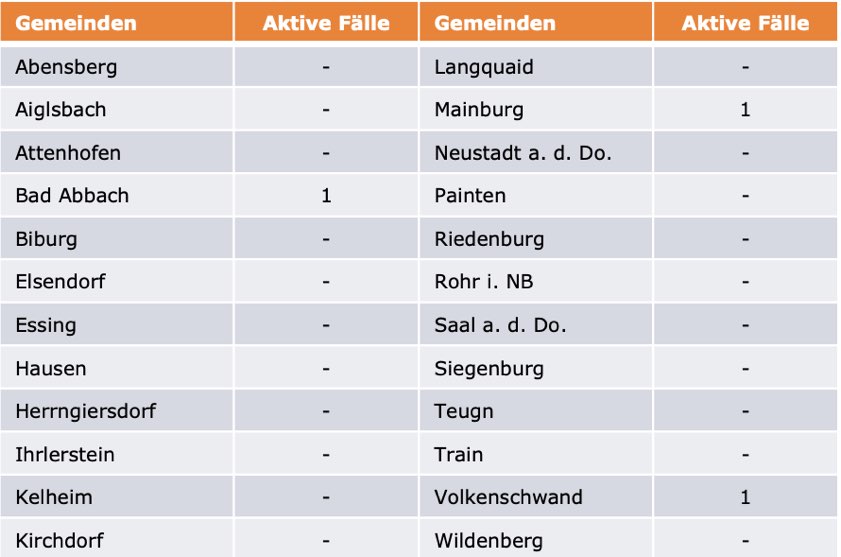 (ty) Im Kreis Kelheim gibt es in Zusammenhang mit der Corona-Pandemie, wie berichtet, mittlerweile 110 Menschenleben zu beklagen. Die weitere Situation stellt sich wie folgt dar: Unter Verweis auf Daten des Gesundheitsamts teilte das Landratsamt heute mit, dass – Stand gestern, 16 Uhr – die Zahl der im Kreis Kelheim positiv auf den neuartigen Erreger getesteten Menschen bei insgesamt 6055 liegt: Einer mehr als gestern gemeldet. Bekanntlich wurde im Kreis Kelheim auch bereits die so genannte Delta-Variante nachgewiesen. Insgesamt 5942 hiesige Corona-Patienten (gestern: 5942) wurden wieder aus der Quarantäne entlassen und gelten als genesen. Derzeit gebe es drei aktive Corona-Fälle im Landkreis (gestern: zwei). Zahlen aus den einzelnen Gemeinden zeigt die Tabelle unten.