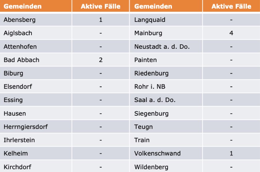 (ty) Im Kreis Kelheim gibt es in Zusammenhang mit der Corona-Pandemie, wie berichtet, mittlerweile 110 Menschenleben zu beklagen. Die weitere Situation stellt sich wie folgt dar: Unter Verweis auf Daten des Gesundheitsamts teilte das Landratsamt heute mit, dass – Stand gestern, 16 Uhr – die Zahl der im Kreis Kelheim positiv auf den neuartigen Erreger getesteten Menschen bei insgesamt 6060 liegt: Fünf mehr als gestern gemeldet. Bekanntlich wurde im Kreis Kelheim auch bereits die so genannte Delta-Variante nachgewiesen. Insgesamt 5942 hiesige Corona-Patienten (gestern: 5942) wurden wieder aus der Quarantäne entlassen und gelten als genesen. Derzeit gebe es acht aktive Corona-Fälle im Landkreis (gestern: drei). Zahlen aus den einzelnen Gemeinden zeigt die Tabelle unten.