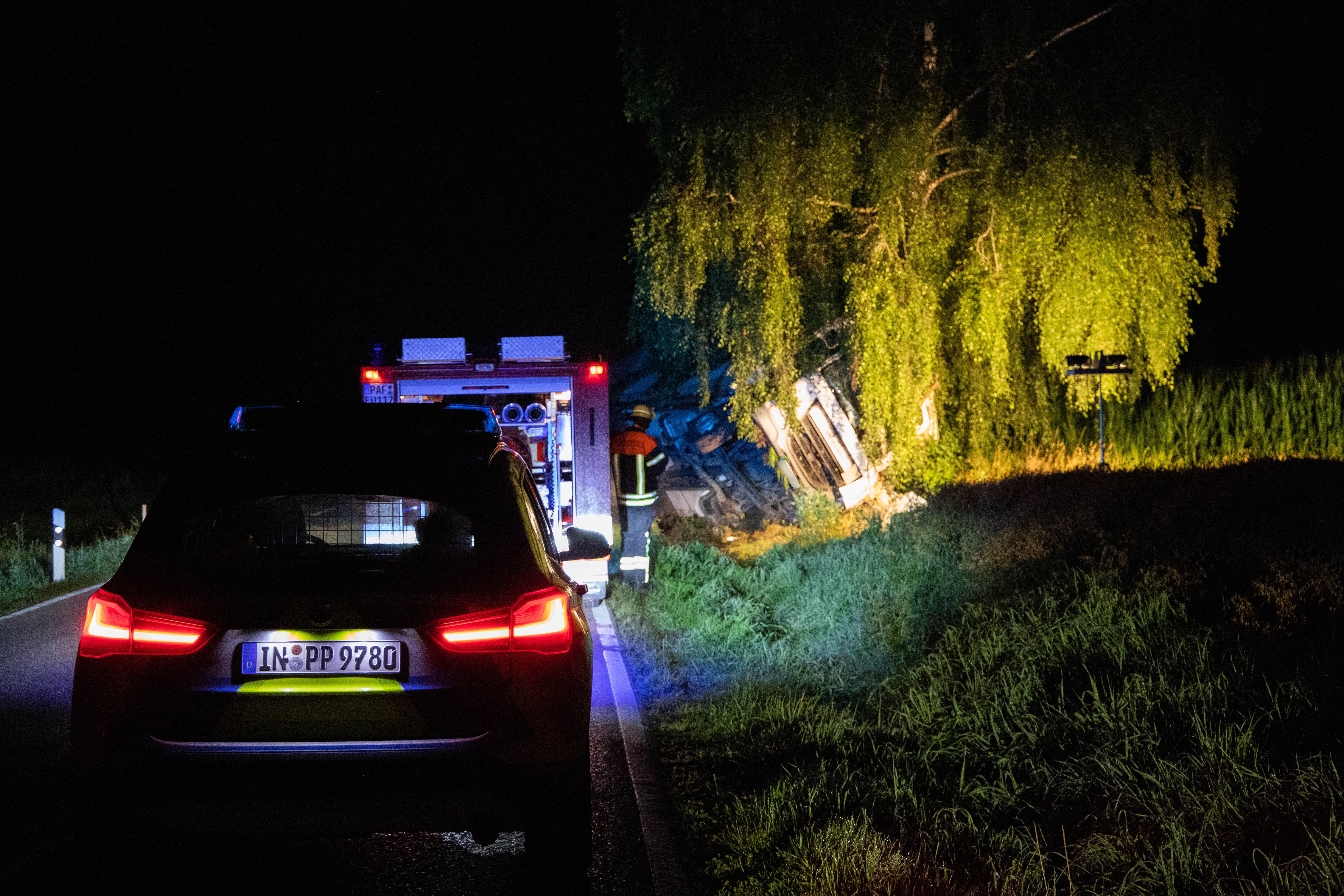 Nach Angaben der Pfaffenhofener Polizeiinspektion geschah das Unglück heute gegen 3.10 Uhr, als der 57-Jährige aus Augsburg mit dem Lastwagen auf der genannten Staatsstraße – von Gerolsbach her kommend – in Richtung Euernbach unterwegs war. Kurz vor dem Scheyerner Ortsteil Euernbach sei der Lkw ohne Beteiligung anderer Verkehrsteilnehmer nach links von der Straße abgekommen, weil der 57-Jährige einem großen Wildtier habe ausweichen wollen.