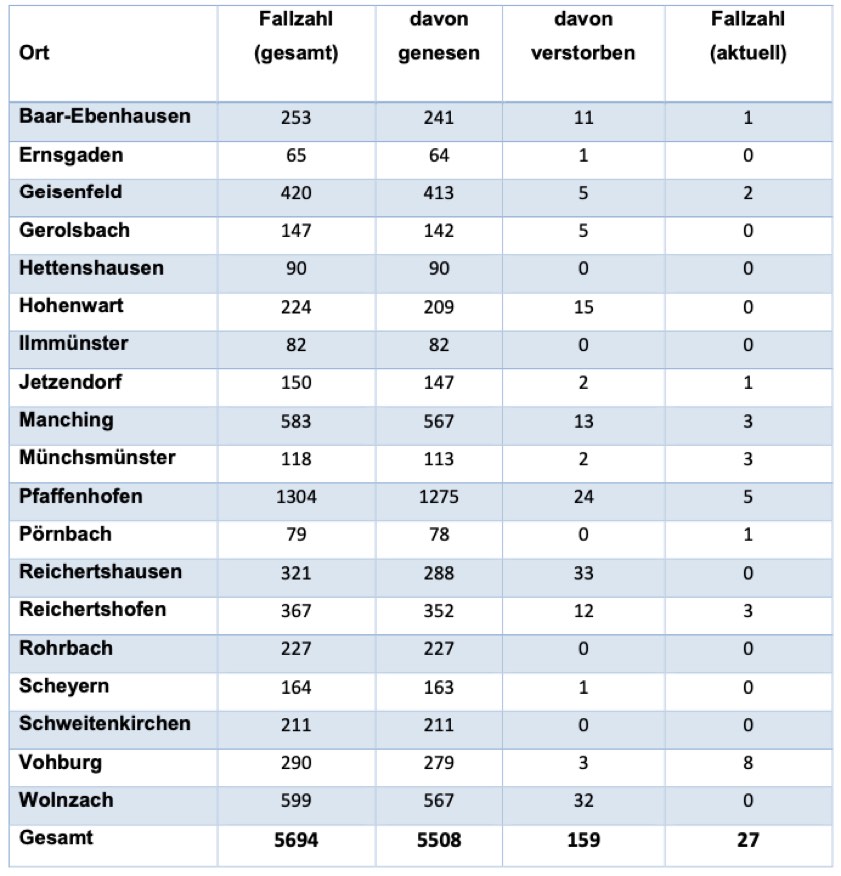 (ty) In Zusammenhang mit der Corona-Pandemie gibt es im Kreis Pfaffenhofen, wie berichtet, mittlerweile 159 Menschenleben zu beklagen. Das Landratsamt veröffentlicht eine tägliche Übersicht (Tabelle unten), in welchen Gemeinden die mit dem Virus infizierten Menschen, die gestorben sind, gelebt haben beziehungsweise wie viele bestätigte Infektionsfälle und genesene Patienten es in welcher Kommune gibt. Die Zahl der Landkreis-Bürger, die positiv auf den neuartigen Erreger getestet worden sind, hat sich seit der Meldung von gestern um zwei erhöht und beträgt somit aktuell 5694.