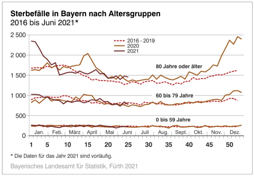 Regional waren nach wie vor große Unterschiede festzustellen: Während die Sterbefall-Zahl im Landkreis Coburg im Juni heuer gut 26 Prozent unter dem Durchschnittswert der Vorjahre lag, wiesen einige kreisfreie Städte und Landkreise eine Erhöhung der Sterbefall-Zahlen um 30 Prozent oder mehr auf: so zum Beispiel die Städte Coburg (plus 55 Prozent) und Passau (plus 30 Prozent). Deutlich höhere Sterbefall-Zahlen als in den Jahren 2016 bis 2019 hatte auch der Landkreis Berchtesgadener Land (plus 31 Prozent).