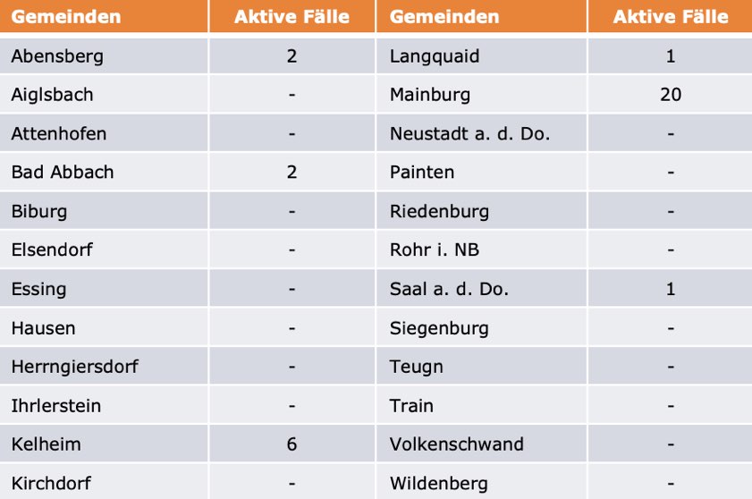 (ty) Im Kreis Kelheim gibt es in Zusammenhang mit der Corona-Pandemie, wie berichtet, mittlerweile 110 Menschenleben zu beklagen. Die weitere Situation stellt sich wie folgt dar: Unter Verweis auf Daten des Gesundheitsamts teilte das Landratsamt heute mit, dass – Stand gestern, 16 Uhr – die Zahl der im Kreis Kelheim positiv auf den neuartigen Erreger getesteten Menschen bei insgesamt 6086 liegt: Das ist einer mehr als gestern gemeldet. Bekanntlich wurde im Kreis Kelheim auch bereits die so genannte Delta-Variante nachgewiesen. Insgesamt 5944 hiesige Corona-Patienten (gestern: 5943) wurden wieder aus der Quarantäne entlassen und gelten als genesen. Derzeit gebe es 32 aktive Corona-Fälle im Landkreis (gestern: 32). Zahlen aus den einzelnen Gemeinden zeigt die Tabelle unten.